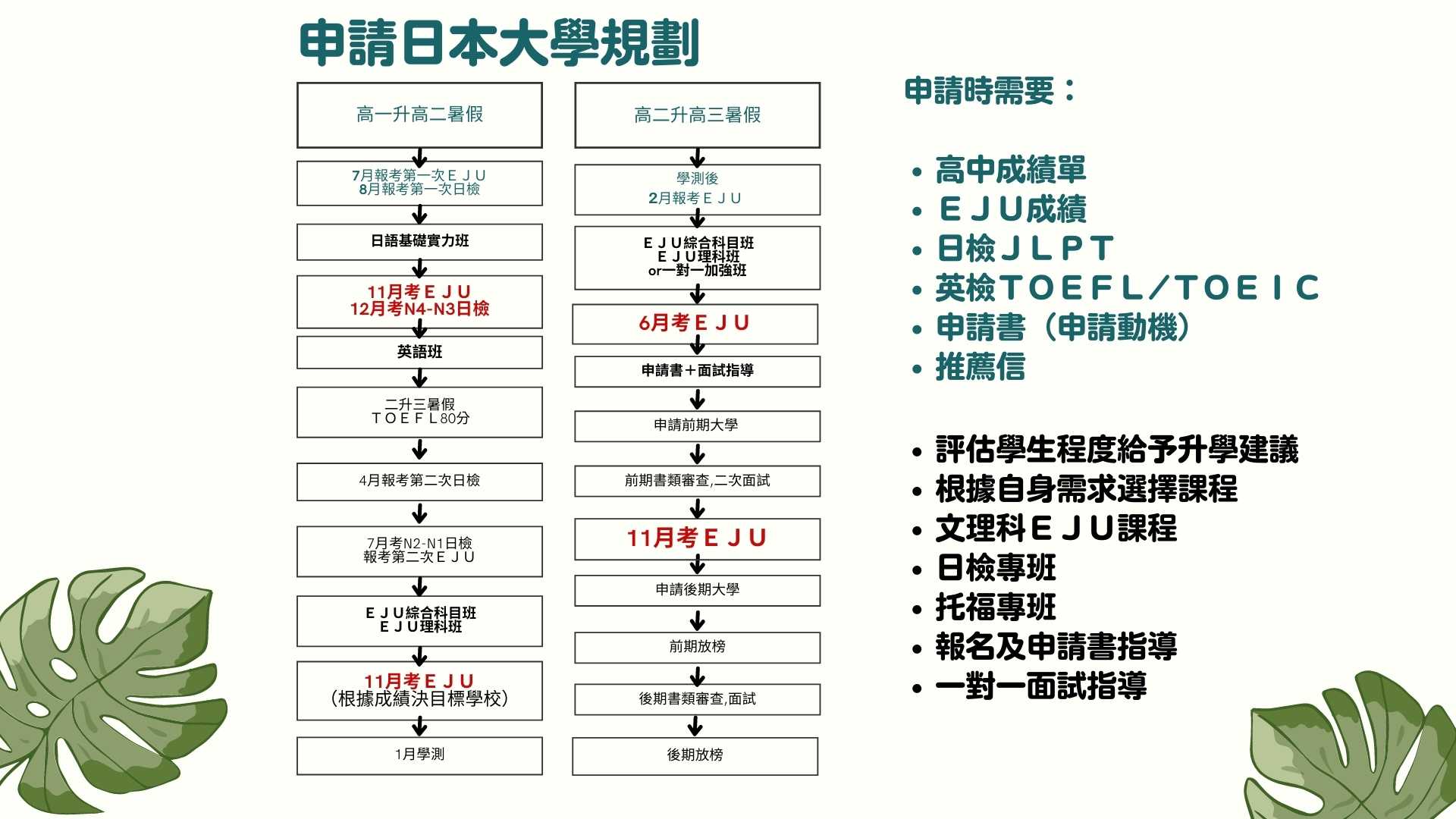 基礎日文 → 英檢 → 進階日文+EJU學科 → 申請書 → 推薦信(如有需要)